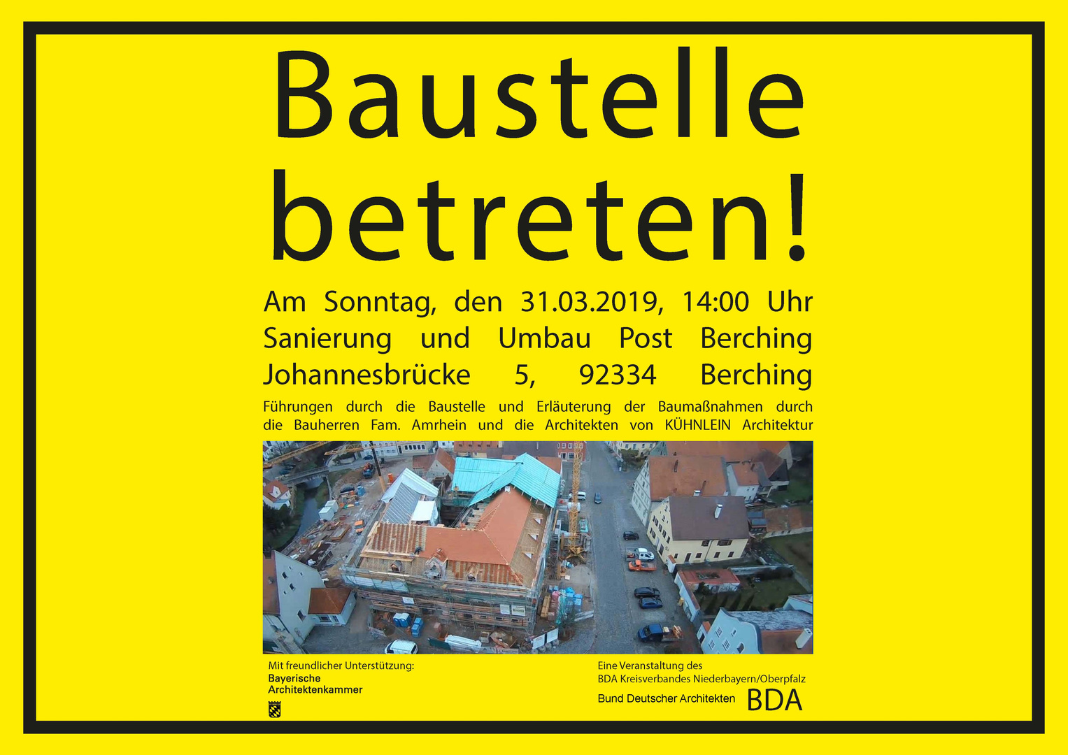 Die Sanierung des Post-Areals in der Vorstadt von Berching ist ein Meilenstein für die Belebung des Stadtkerns. Das barocke Gebäudeensemble wird nach jahrelangem Leerstand saniert und zu einem Hotel mit Restaurant, Bar und Seminarräumen umgebaut. Am Sonntag um 14:00 Uhr werden Führungen durch die Baustelle angeboten. Neben den Bauherren Denise und Christian Amrhein führen die Architekten von Kühnlein Architektur sowie Zimmerermeister Manfred Bogner durch die Baustelle.