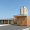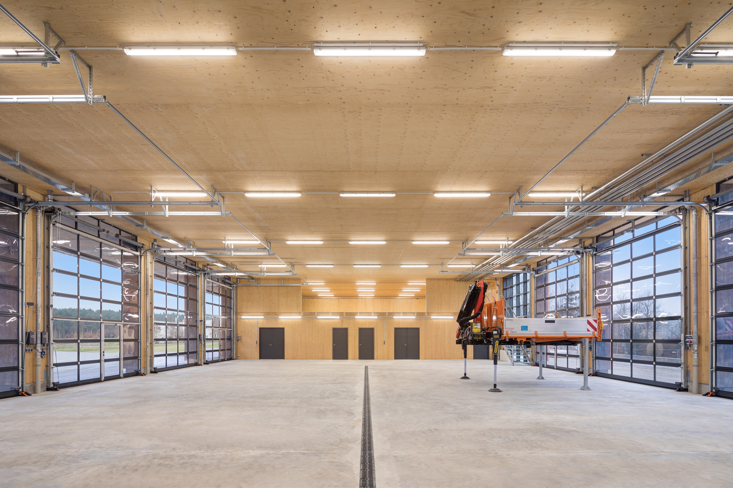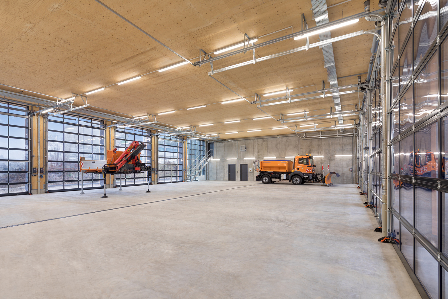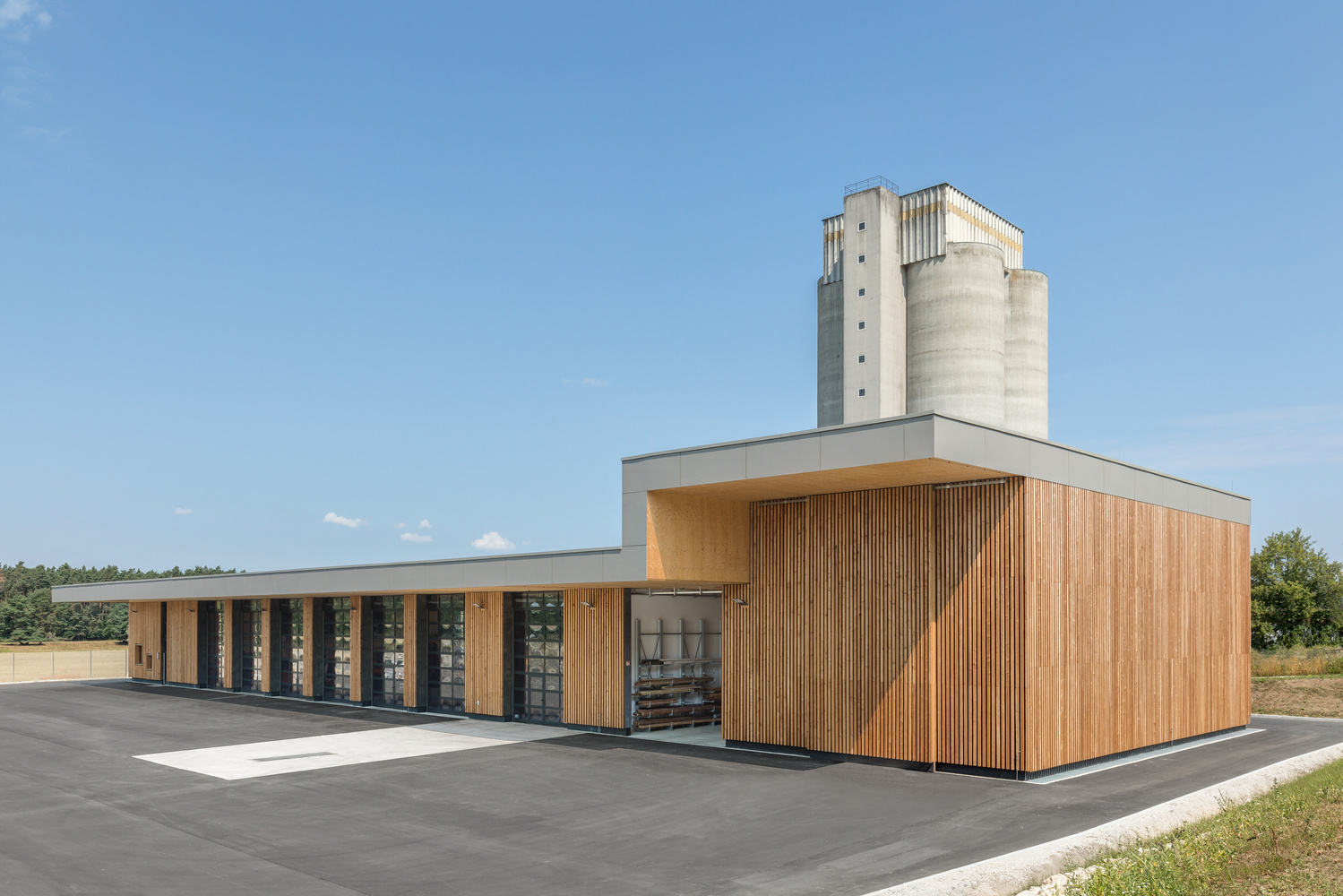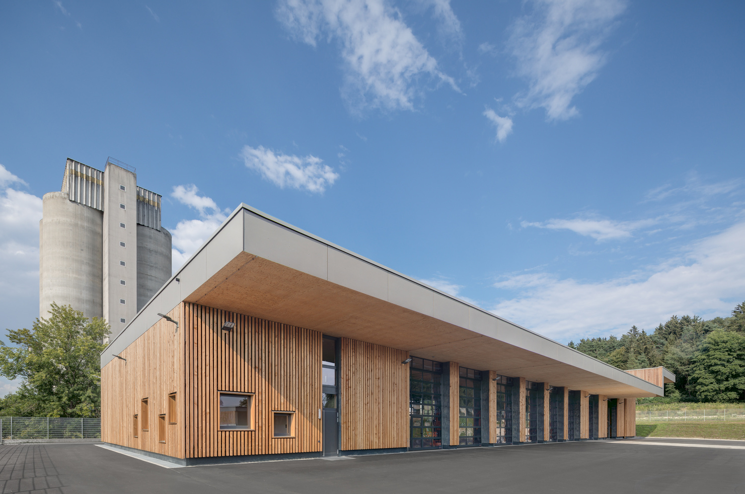 Das Gebäude wurde bis auf die Waschhalle komplett in Holzbauweise errichtet. Dafür wurde ein Tragsystem aus Holzrippen im Verbund mit Mehrschichtplatten entwickelt. Dadurch wird die statische Trägerhöhe auf 30cm reduziert und eine wirtschaftliche Konstruktion ermöglicht. Das Tragsystem überspannt die das komplette Gebäude und das Vordach. Insgesamt 25m Tragweite.