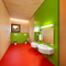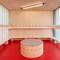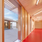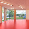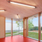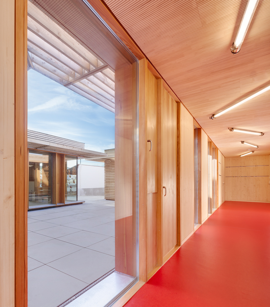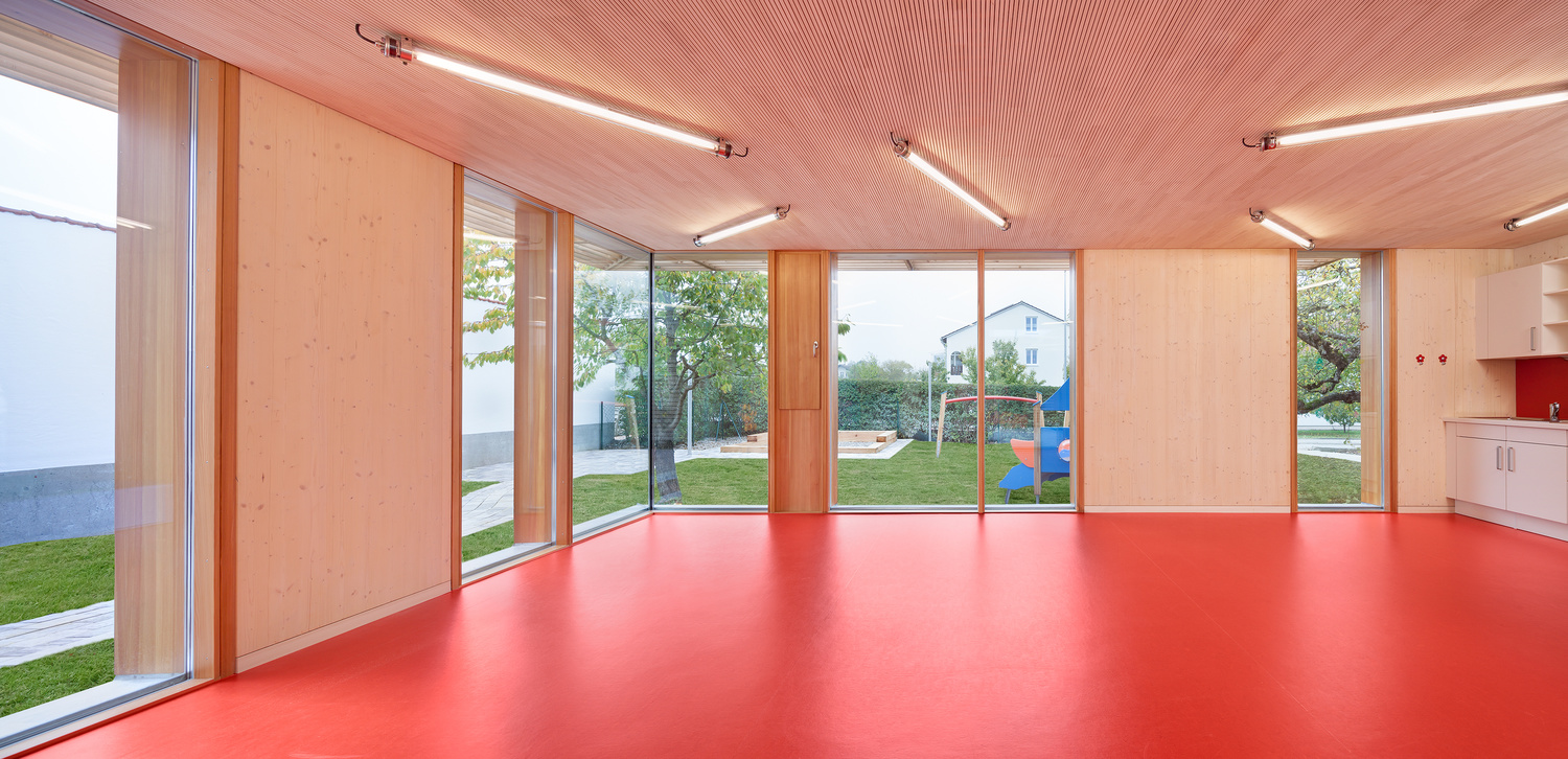 Das Gebäude ist im rückwärtigen Bereich des Grundstückes platziert. Somit bleiben alle Obstbäume erhalten. Die Räumlichkeiten sind um den kleinen Innenhof angeordnet. Die Fassaden zum Hof sind größtenteils raumhoch verglast, um das Atrium mit dem Innenraum verschmelzen zu lassen. Die beiden Gruppenräume orientieren sich zur Obstwiese und zum Innenhof. Durch raumhohe Fenster wird der Außenraum nach innen transferiert.