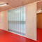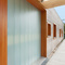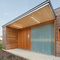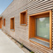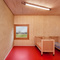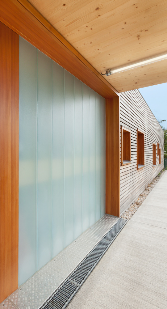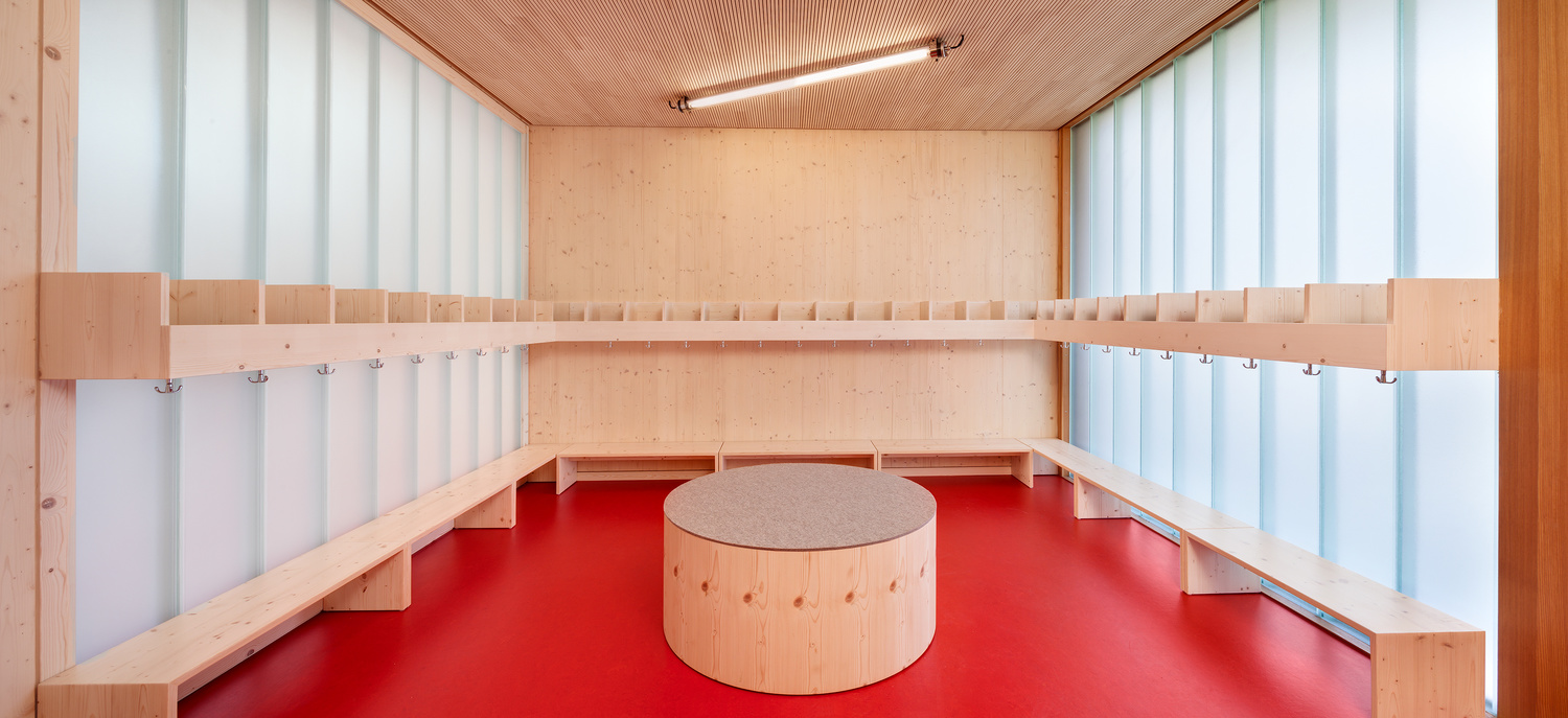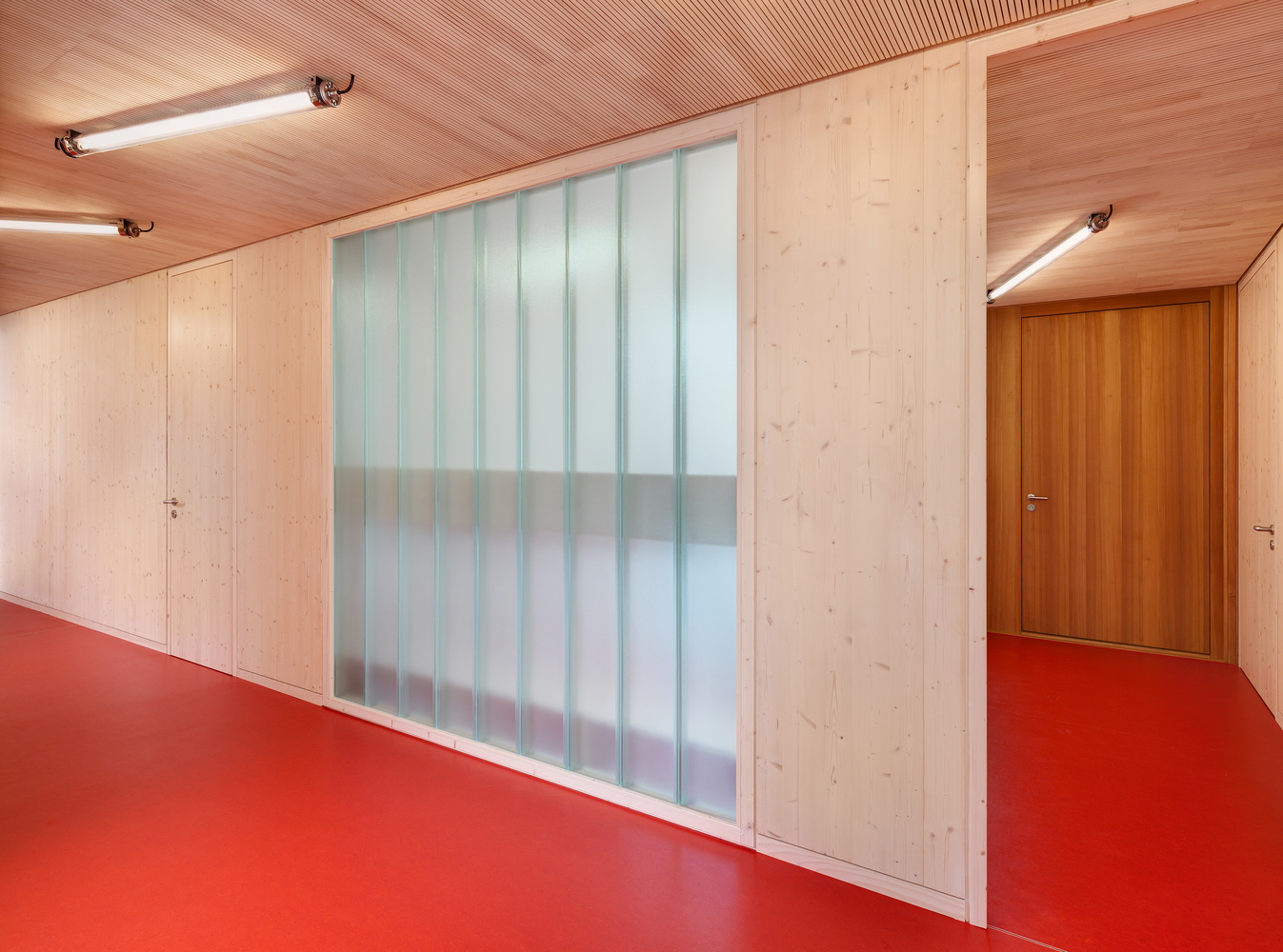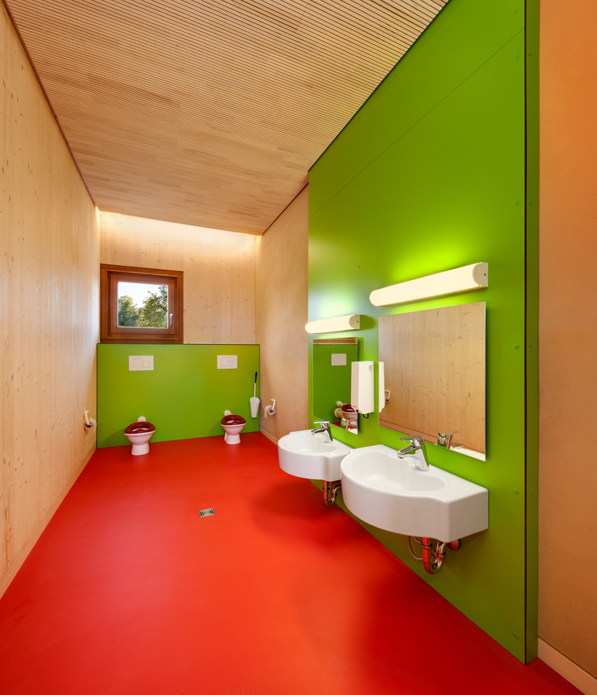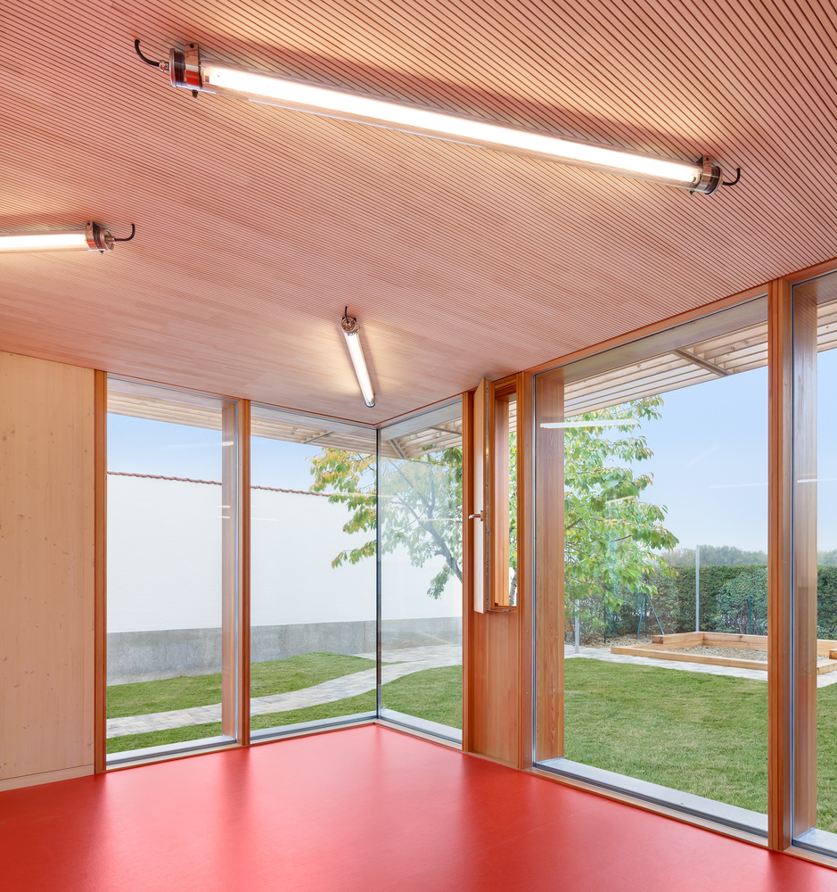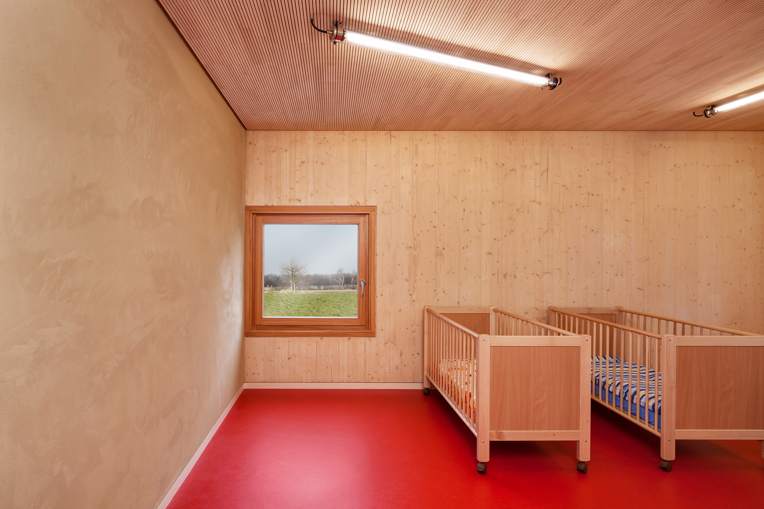 Die rückwärtigen Fassaden werden geschlossen gehalten und nur wo nötig mit kleinen gestreuten Fenstern durchbrochen. Der aufgesetzte Schirm als Sonnenschutz gibt dem Volumen eine horizontale Linie und lässt die Kinderkrippe als luftigen Pavillon zwischen den Obstbäumen erscheinen.