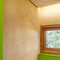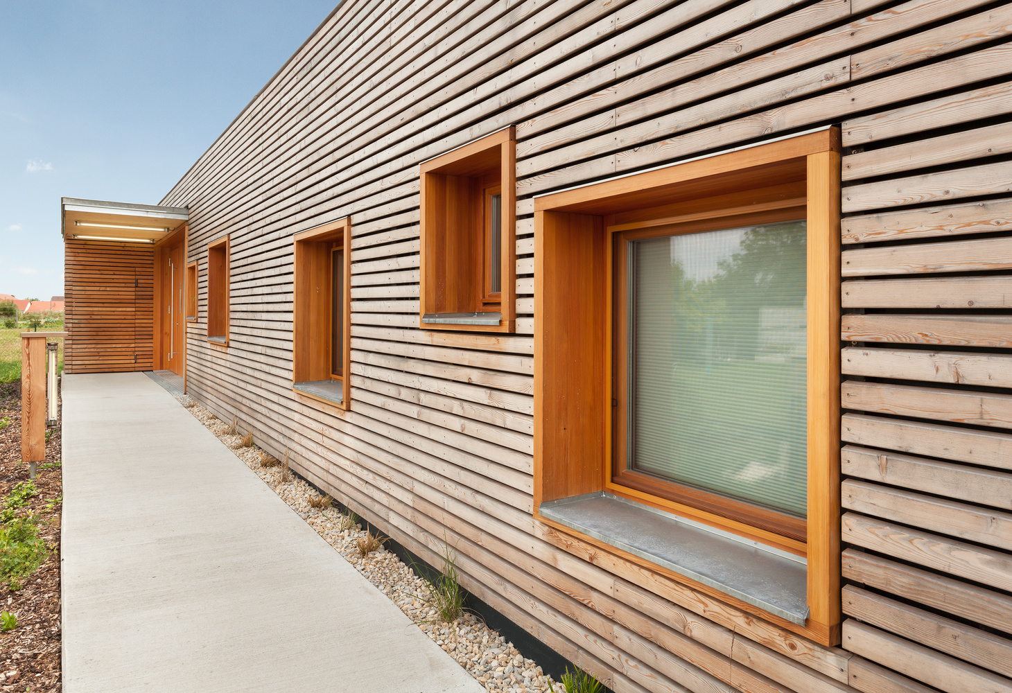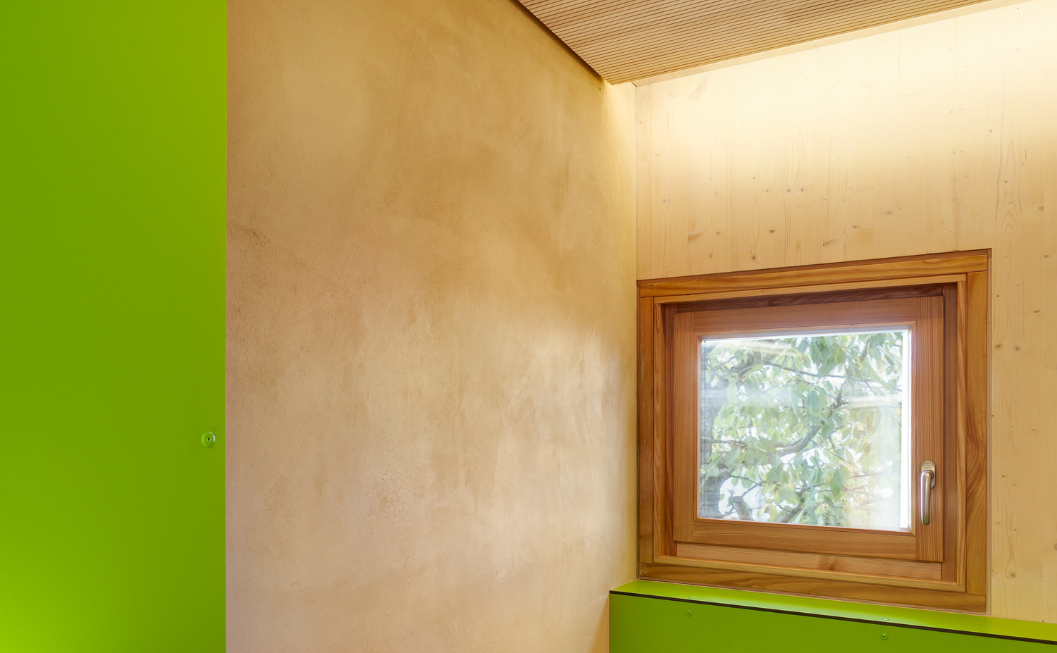 Bei der Ausführung wurde darauf geachtet, dass nur ökologische, unbedenkliche Materialien zum Einsatz kommen. Die Wandkonstruktion besteht aus 10cm starken Massivholzelementen, die innen komplett sichtbar sind. Im Kontrast der Fassaden aus unbehandelter Lärche, die bald einen silbrig-grauen Farbton annehmen wird, stehen die geölten Lärchenholzfenster.