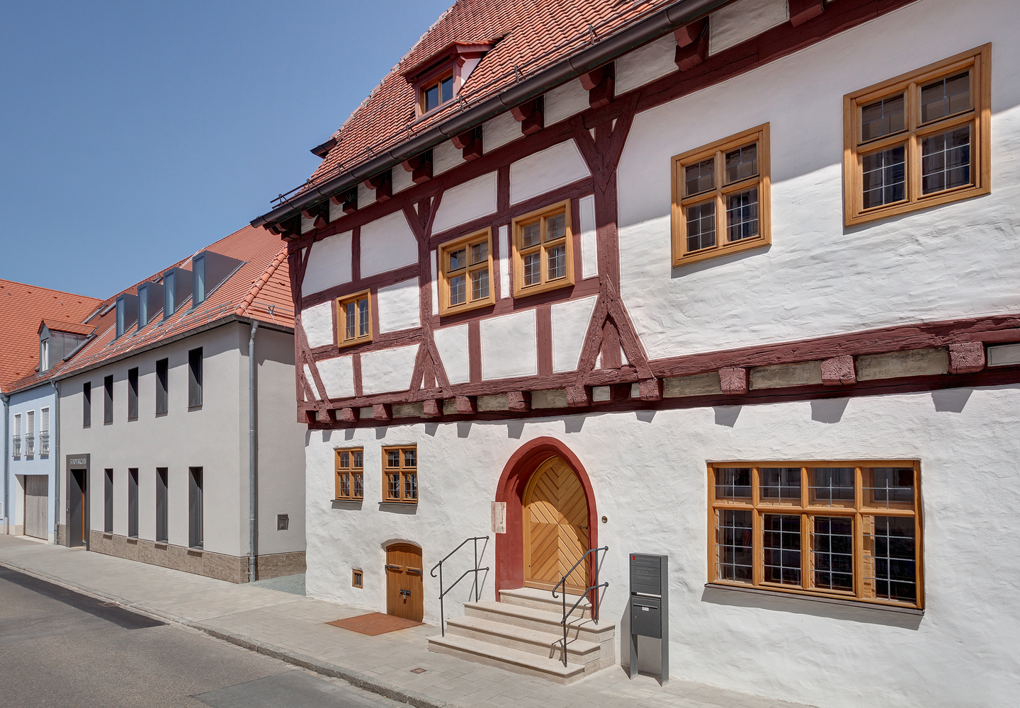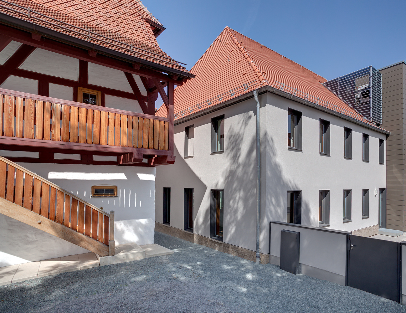 Der Neubau in dieser historisch bedeutsamen Umgebung nimmt in seiner städtebaulichen Erscheinung, seiner Baumasse und in der Materialität Rücksicht auf sein Umfeld und setzt sich dennoch in seiner Architektur mit modernen Akzenten als schlichter zeitgemäßer Bau ab.