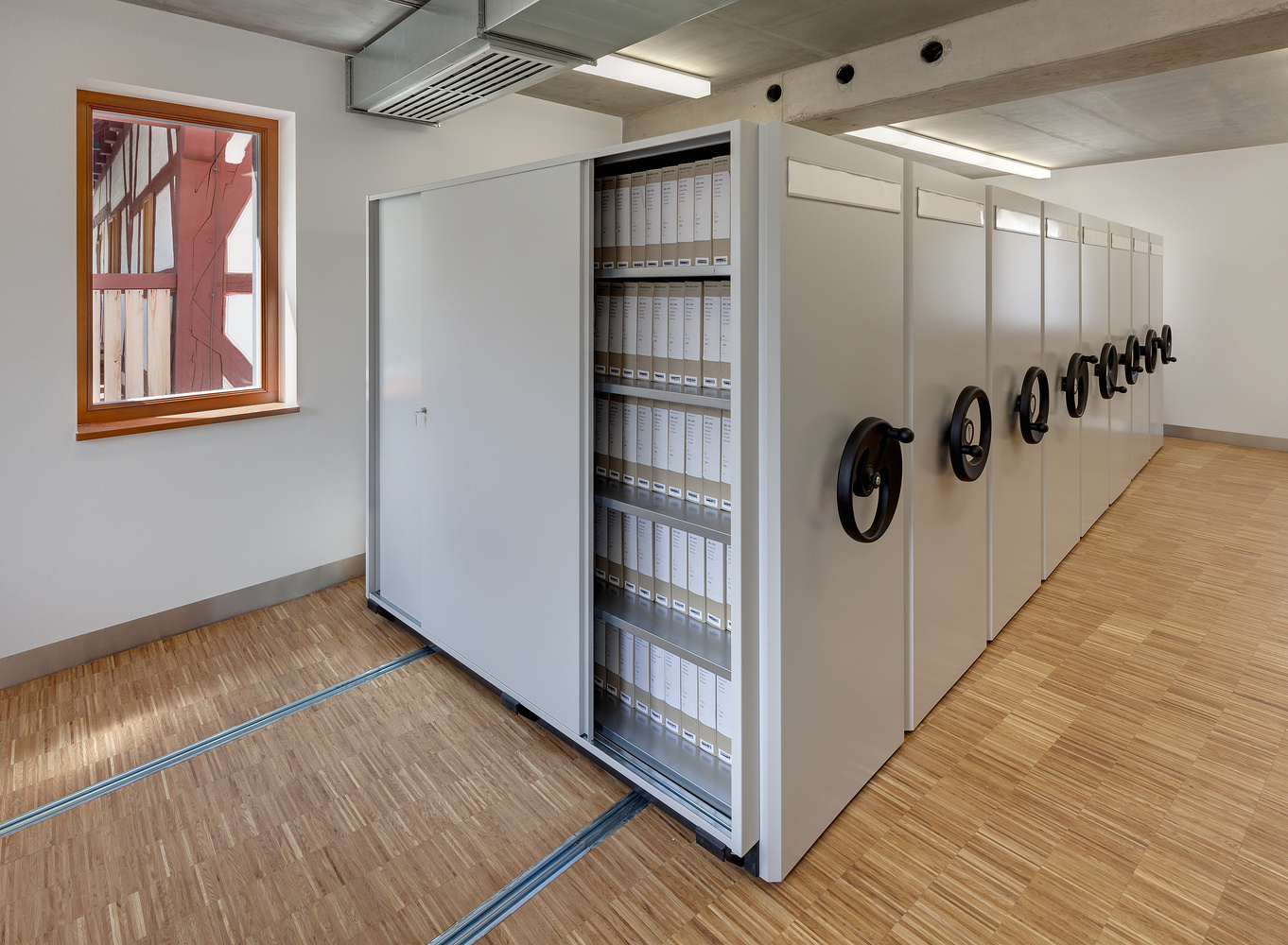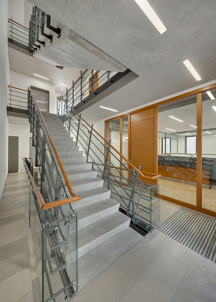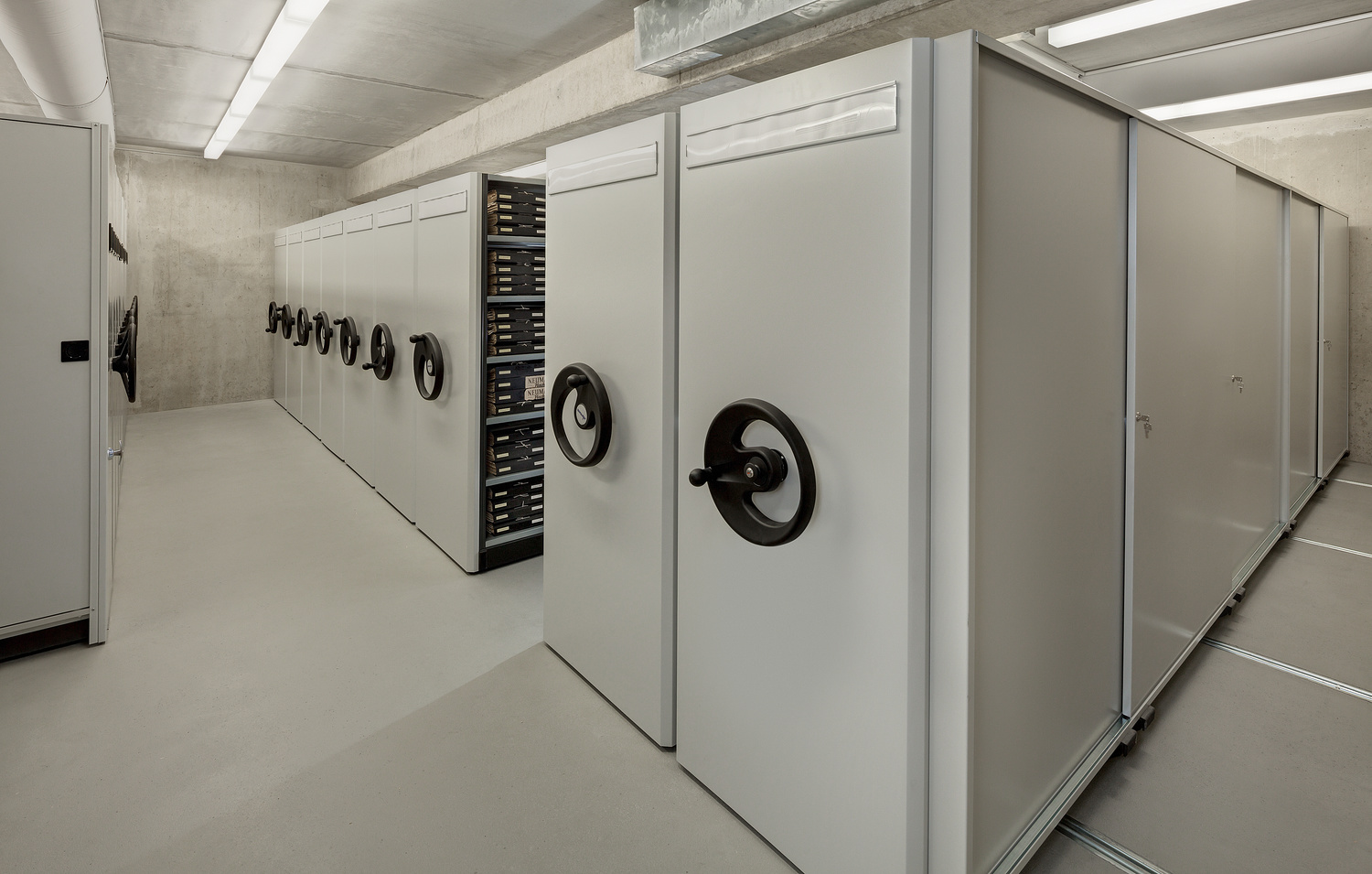 Das Obergeschoss umfasst Arbeitsräume und Archivflächen. Im stützenfreien Dachgeschoss sind ebenso wie im Untergeschoss weitere Archivflächen untergebracht.