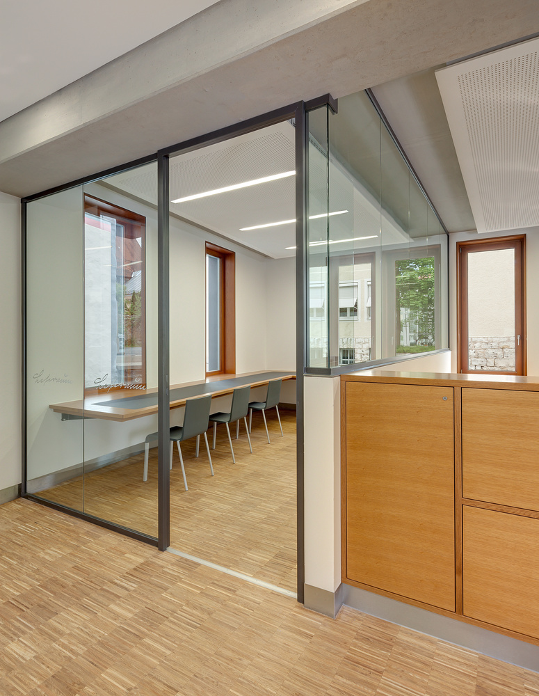 Im Erdgeschoss befinden sich die zentralen, öffentlich frequentierten Anlaufstellen mit Rezeption, Beratung, Office und Leseräumen sowie ein Rollstuhlfahrer-WC und Teeküche.