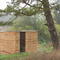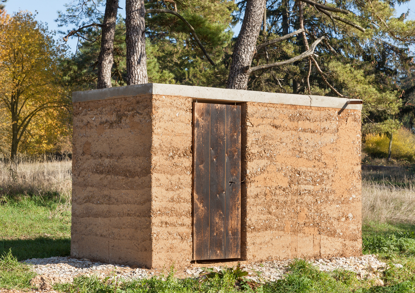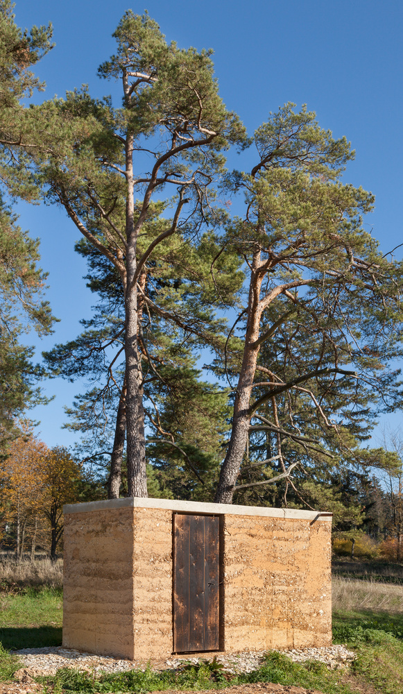 Experiment, ein Gebäude mit gestampfter Erde zu errichten. Ein stilles Örtchen am Feldrand.
