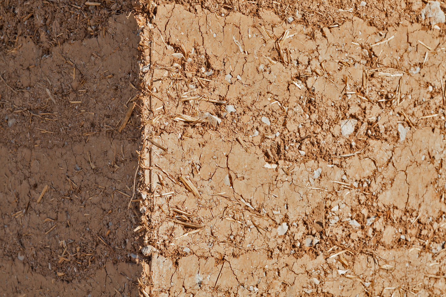 Die lehmige Erde vermischt mit Stroh ist statisch tragend, ohne Stützen, Beton, Holz oder Stahl. Überdacht mit einer Betonplatte.