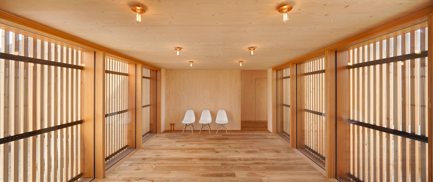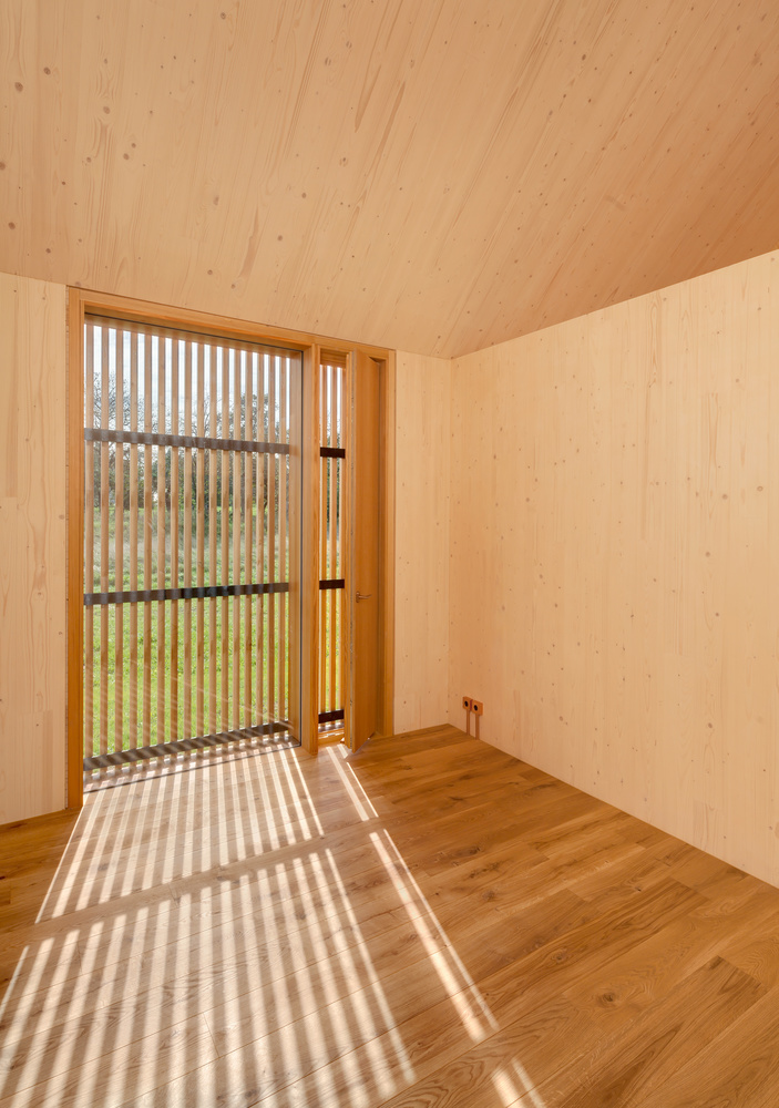 Durch eine schwimmende Gründung der 20cm starken Stahlbetonplatte auf Glasschaumschotter konnte auf aufwändige Fundamente und Frostriegel verzichtet werden. Alle Brettsperrholzoberflächen sind innen sichtbar, folglich waren keine Verkleidungen oder Verputzarbeiten notwendig.